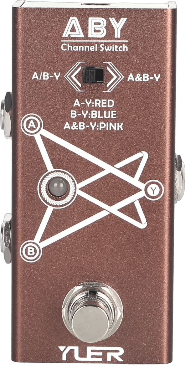 The YUER ABY is an A/B/Y switcher/Splitter pedal designed for flexible signal routing between instruments, amplifiers, effect chains, or speaker cabinets. This utility pedal enables users to send a single input signal to two separate outputs (A and B), with the ability to select either output or both simultaneously (“Y” mode). With silent footswitch operation and passive circuitry, the YUER ABY maintains transparent signal flow without interference or coloration. The pedal features a compact, pedalboard-friendly enclosure and is compatible with a variety of gear setups.