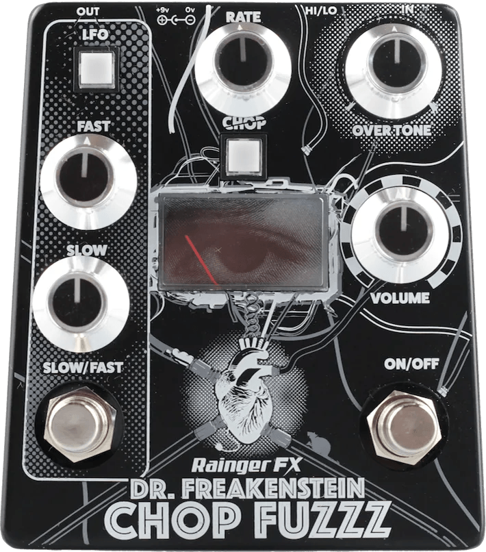 The Rainger FX Dr. Freakenstein Chop Fuzz is an analog fuzz pedal with gated circuitry designed for a distinctive, chopped distortion sound. This fuzz stompbox features two selectable modulation modes, a pressure-sensitive expression pedal input for real-time parameter changes, a tunable drone function that offers ring modulator-style textures, and a built-in noise gate for signal control. The pedal is fully analog and provides multiple options for adjusting and manipulating the fuzz effect.
