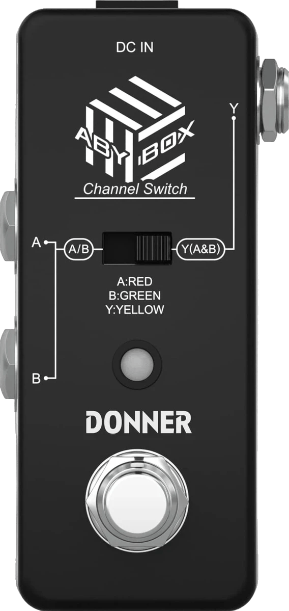 The Donner ABY Box is an AB/Y signal switcher pedal designed for flexible signal routing in pedalboards and audio setups. This utility pedal allows users to select between two outputs (A/B), combine both (Y), or toggle between two input sources. The pedal uses a footswitch for instant channel switching and features true bypass circuitry to preserve signal integrity. The compact design includes clearly labeled input and output jacks for straightforward connectivity.