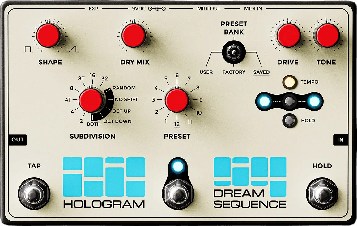 The Hologram Electronics Dream Sequence is a pattern-based pitch shifting effects pedal designed to create rhythmic sequencer-driven modulation. Using an internal sequencer, it shifts your signal up or down by one octave, generating arpeggiator and tremolo effects at mid-tempos, evolving textures at slow speeds, and rapid modulation effects at high rates. Dream Sequence is designed for flexible sound design and features tap tempo control for synchronized rhythmic effects.