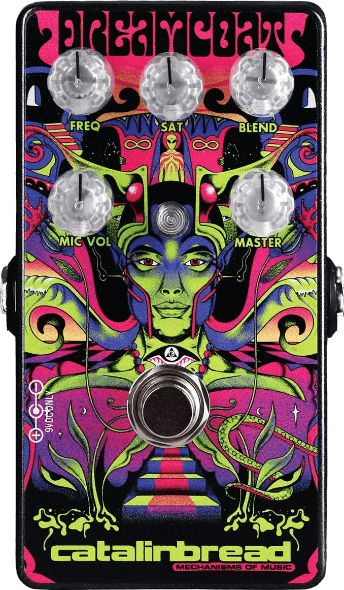 The Catalinbread Dreamcoat is a boost and preamp effects pedal designed to replicate the preamp circuit of the classic Aiwa TP-1011 reel-to-reel deck featured in notable 1960s and 1970s rock recordings. This analog boost pedal provides a variety of tones, from clean signal enhancement to saturated overdrive. A dedicated "Sat" (Saturation) control allows users to dial in added harmonic content for heavier drive textures. Additionally, the frequency boost circuit enhances midrange presence without subtracting frequencies, inspired by passive inductor-based modifications found in vintage setups. True bypass switching preserves signal integrity when bypassed.
