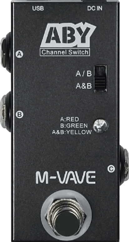 The M-VAVE ABY Line Selector is a compact pedal designed for routing audio signals between two paths in pedalboards, amplifiers, instruments, or speakers (speaker cable required for speaker connections). This ABY pedal features a mode selection switch for toggling between A/B channel operation or simultaneous A+B output, accommodating both one-way and reverse signal flow (A/B to C or C to A/B). Passive operation is supported, with LED indicators functional only when power is supplied. The unit’s full metal chassis provides durability, while its true bypass design ensures minimal signal coloration.