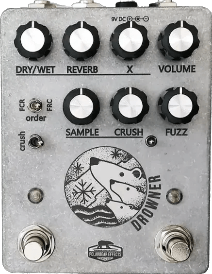 The Polarbear Effects Drowner is a fuzz, bitcrusher, and reverb multi-effects pedal offering three distinct reverb modes: modulation reverb, octave down reverb, and shimmer reverb. Its signal path begins with a silicon-based fuzz circuit, which can be activated independently via the right footswitch. An integrated FX loop, accessible with a TRS Y-cable (stereo male to dual mono TS), allows external effects to be placed between the fuzz and the bitcrusher/reverb stages. This enables a high degree of signal chain customization. The Drowner features true bypass switching for transparent signal integrity when disengaged.