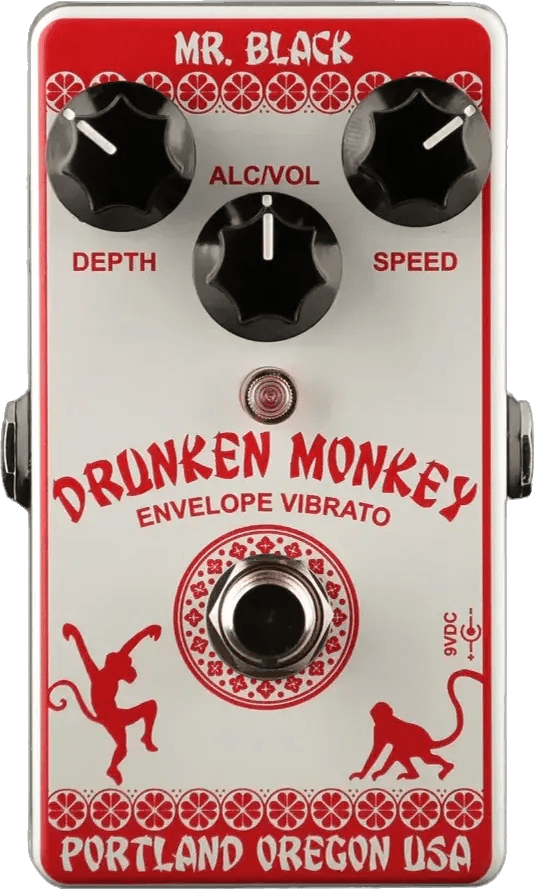 The Mr Black Drunken Monkey Envelope Vibrato is a pitch vibrato effects pedal designed for dynamic modulation of your instrument's pitch. Using envelope-controlled vibrato, this pedal allows for pitch shifting up to a full step above or below the original note, depending on the Depth setting. The unique “Alc/Vol” control introduces additional modulation character to the effect, allowing for either smooth vibrato or more pronounced, modulated movement. The pedal features a straightforward interface, providing responsive envelope performance for precise and expressive vibrato effects.