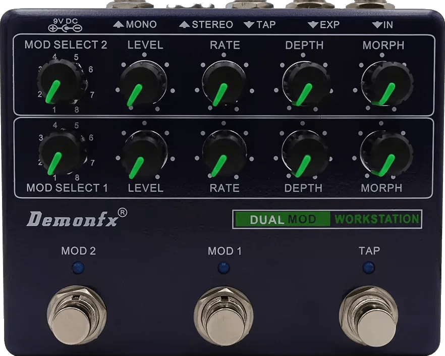 The DemonFx Dual Mod Workstation is a multi-effect modulation pedal designed to deliver a variety of classic and modern modulation sounds. This unit includes two separate effect sections, each providing multiple modulation modes such as chorus, phaser, flanger, tremolo, and more. Each channel features individual control over effect parameters, allowing for customization of tone and modulation depth. Standard 1/4” mono input and output jacks are included for seamless integration with existing pedalboards.