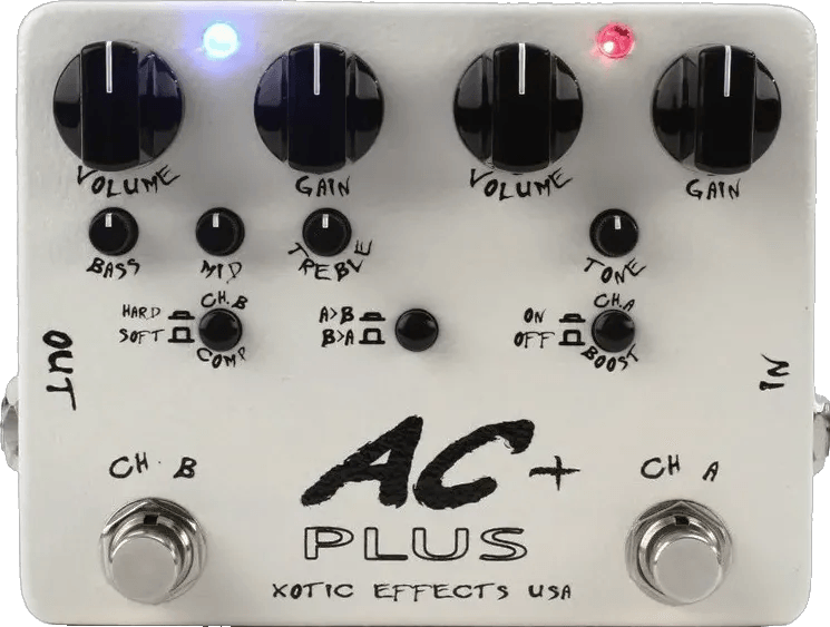 The Xotic AC Plus is a dual overdrive pedal designed to deliver a wide range of overdrive tones with flexible routing and control options. This Xotic effects pedal features two independent overdrive channels, each with dedicated controls, allowing stacking of channel A into B or B into A. Channel A includes an additional boost function for extended tonal possibilities. Standard input and output jacks provide straightforward connectivity, and true bypass switching preserves signal clarity.