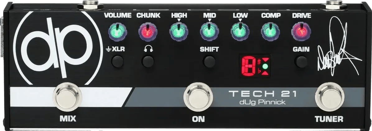 The Tech 21 dUg DP-3X is an all-analog bass preamp and distortion pedal designed to recreate dUg Pinnick’s signature sound, merging high-end distortion with robust low-end response. This compact effects pedal features a Mix mode that activates Drive and Chunk for harmonics and bass distortion, while Clean mode bypasses these for traditional bass tones. Control options include a 3-band active EQ with a switchable midrange, a Gain function for added compression and distortion, and a master Volume. Connectivity includes a direct XLR output suitable for studio or stage, headphone output, and built-in chromatic tuner. The DP-3X bass pedal supports both clean and overdriven signals while retaining warmth and detail.