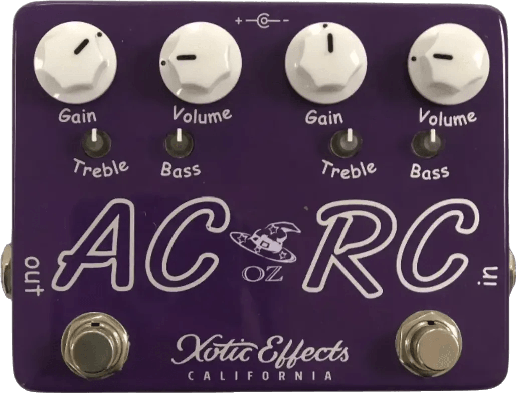The Xotic AC/RC-OZ Oz Noy signature overdrive/booster pedal is a limited edition dual-channel effects pedal that combines the AC Booster and RC Booster circuits in a single unit. Each channel operates independently with its own 2-band EQ, offering flexible tone shaping and stackable gain options. LED channel indicators show the current active circuit. The AC/RC-OZ is custom-designed to Oz Noy's specifications and allows users to blend or switch between distinct overdrive and clean boost sounds.