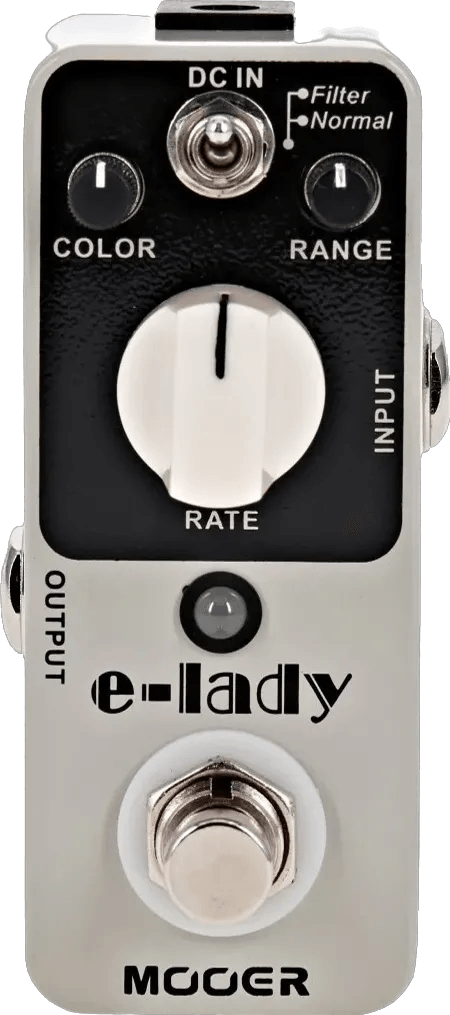 The MOOER E-Lady is an analog flanger pedal designed to deliver classic modulation effects, with selectable Normal and Filter operating modes. This compact stompbox features core flanger controls for Rate, Color, and Range, allowing detailed adjustment of the modulation speed, tonal shape, and sweep width. An additional Filter mode provides static filtering, while the Oscillator function generates sweeping, LFO-driven effects for expanded sound design options.