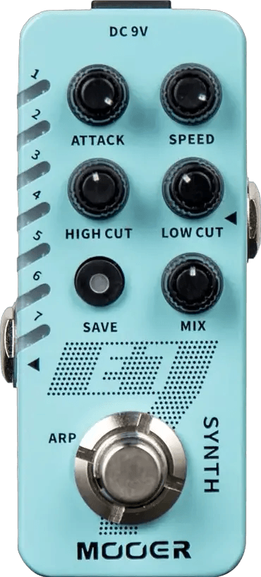 The MOOER E7 Polyphonic Synth pedal is a polyphonic synthesizer effects pedal designed to generate a variety of electronic synth sounds using a standard instrument signal, with no need for special pickups or modifications. It features seven distinct synth presets, including trumpet, organ, sine LFO, square LFO, 8-bit synth, and synth pad modes. Each preset can be individually edited and includes controls for arpeggiator, high and low frequency cut, attack, and speed, giving users a wide range of sound-shaping options. The pedal offers true bypass for uncolored signal when disengaged.