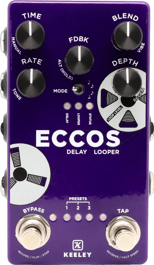 The Keeley Eccos Delay & Looper (2k24 Purple LTD) is a true stereo delay pedal with integrated looper functionality. This Keeley effects pedal offers detailed control over tape-style analog delay sounds and includes a dedicated looper with performance features. The dual footswitch design supports true bypass operation, tap tempo, and endless feedback in delay mode, while enabling recording, playback, reverse, half-speed, and play-once functions in looper mode. Engineered using 24/56-bit Dream DSP, the Eccos delivers high-fidelity effects processing. This pedal is designed for use with a range of instruments and provides extensive options for creative signal routing and manipulation.