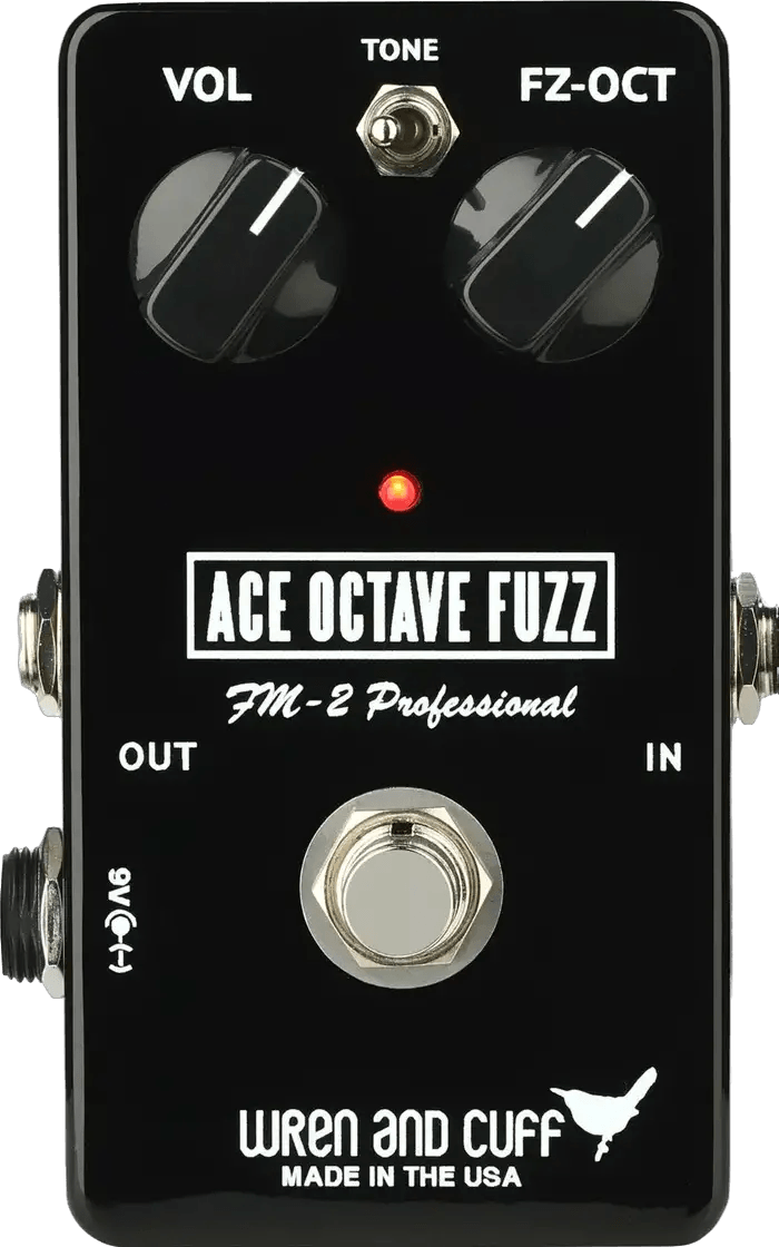 The Wren and Cuff Ace Octave Fuzz is an octave fuzz effects pedal that recreates the circuitry and sound of the vintage Acetone FM-2 Professional. This pedal features a bold fuzz tone with a distinct octave-up effect, particularly pronounced above the 12th fret. It stands apart from other octave fuzz stompboxes with its unique voicing, offering a tonal character that differs from the Tycobrahe Octavia and Univox Superfuzz models. A dedicated tone toggle switch allows users to choose between a midrange-focused sound or a low-end-heavy response.