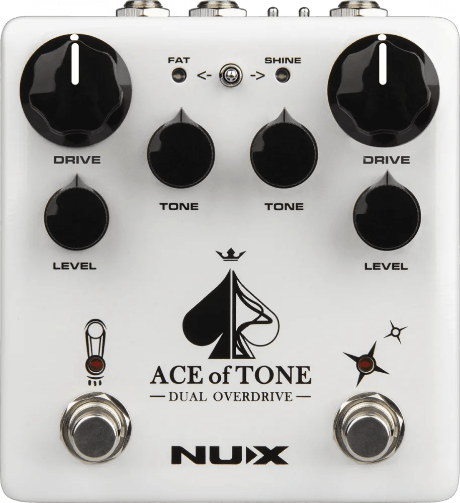 The NUX Ace of Tone is a dual overdrive effects pedal combining the Tubeman MKII and Morning Star circuits in a single unit. The left channel features the Tubeman MKII overdrive (based on the classic Tube Screamer) with an added FAT mode, activated via footswitch hold, which increases bass response and produces a warmer sound profile. The right channel incorporates the Morning Star overdrive (inspired by the Bluesbreaker design) with a SHINE mode accessible by holding the footswitch, enhancing treble for a brighter signal. Each side can be used independently or stacked, making the Ace of Tone a flexible overdrive pedal for various tonal combinations.