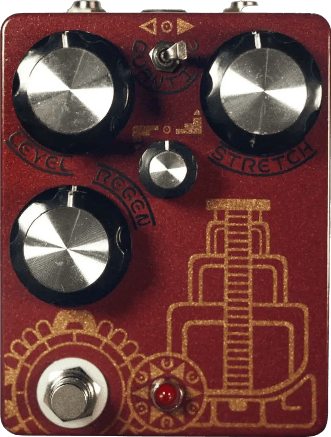 The Hungry Robot Pedals El Castillo is an arpeggiating reverb effects pedal designed for experimental soundscapes. It combines reverb, pitch-shifting, and delay within its signal path to generate pitch-bent reverb textures and layered, ambient effects. The reverb section provides both level and regeneration (Regen) controls, utilizing a high-quality reverb brick. Pitch-shifting occurs in the feedback loop, causing the pitch of the wet signal to incrementally shift with each repeat for pronounced stair-step modulation. A single-repeat delay (0–800ms range) is also present in the feedback path, controlling the timing and stretch of each pitch shift to create either rapid steps or gradual arpeggiation. This pedal operates in mono and supports both standard and experimental sound design applications.