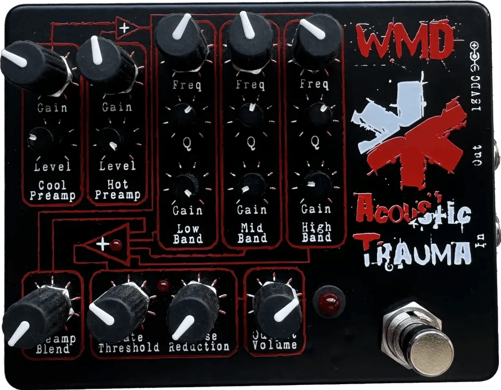 The WMD Acoustic Trauma is an overdrive/distortion effects pedal designed for a wide range of tonal shaping and high-gain applications. Two preamps offer adjustable gain from light breakup to saturated distortion. A three-band parametric EQ section provides selectable frequency boosts or cuts for detailed tone control. The pedal includes a noise gate that reduces background noise during high-gain operation.