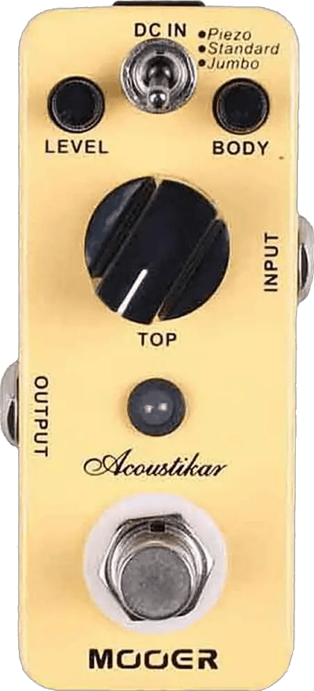 The MOOER Acoustikar is an acoustic simulation effects pedal designed to transform electric guitar signals into acoustic-style tones. This stompbox features three selectable simulation modes: Piezo, Standard, and Jumbo, providing a range of acoustic timbres. Controls for level, body, and top allow precise adjustment of output volume, resonance, and brightness to match player preference. The Acoustikar effects pedal supports true bypass switching, preserving tone when the pedal is not engaged.