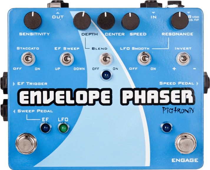 The Pigtronix Envelope Phaser EP2 is an analog envelope phaser effects pedal that offers phase shifting controlled by envelope, LFO, or a combination of both modulation sources. Designed for versatile harmonic modulation, this phaser pedal features an integrated “Staccato” circuit for enhanced envelope tracking and response during fast or percussive playing. Players can adjust phase effects independently with controls for envelope and LFO, blending between both for a wide range of sounds. The Staccato function enables quick envelope resets between notes, improving articulation and accuracy in rapid playing passages. Compatible with bass instruments.