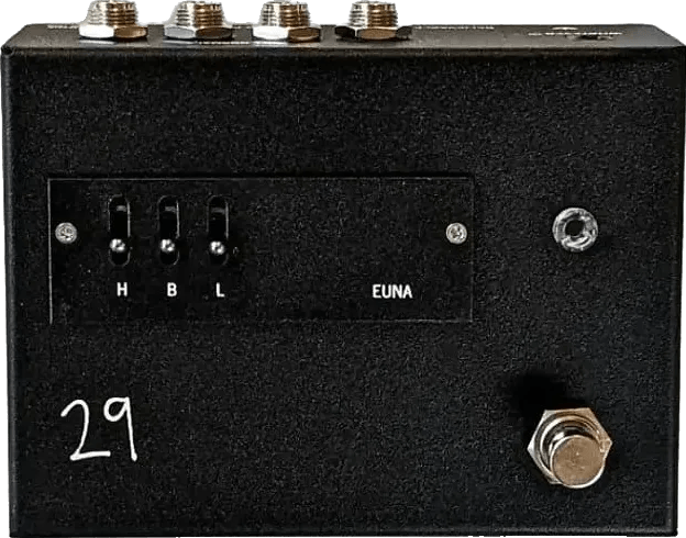The 29 Pedals EUNA Black Edition is an input driver pedal designed to replace a traditional buffer, offering protection and signal conditioning at the front of your effects chain. Incorporating console-grade construction, this unity amplifier includes three selectable filter options to tailor your signal. An alternate-path insert loop is provided for integrating classic fuzz or wah pedals that are sensitive to buffering. The pedal is equipped with the 29 Pedals WHATEVER power supply, accepting 7.5 to 35 volts AC or DC in either polarity while maintaining consistent tone. Manufactured in California by 29 Pedals, the EUNA Black Edition is positioned as a first-in-chain utility for signal management.