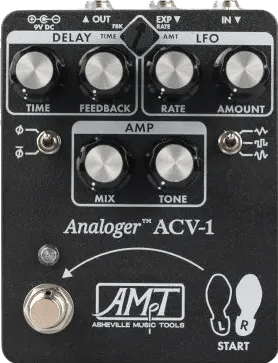 The Asheville Music Tools ACV-1 is an analog chorus and vibrato effects pedal, also capable of producing slapback delay and comb filter modulation through a modulated BBD (bucket-brigade device) delay line. This analog modulation pedal offers a range of effects, from classic chorus and true pitch vibrato to more experimental sounds like metallic resonances and short slapback echoes. Synth-inspired controls allow for flexible shaping of modulation rate, depth, and delay time, providing nuanced control over tonal textures.