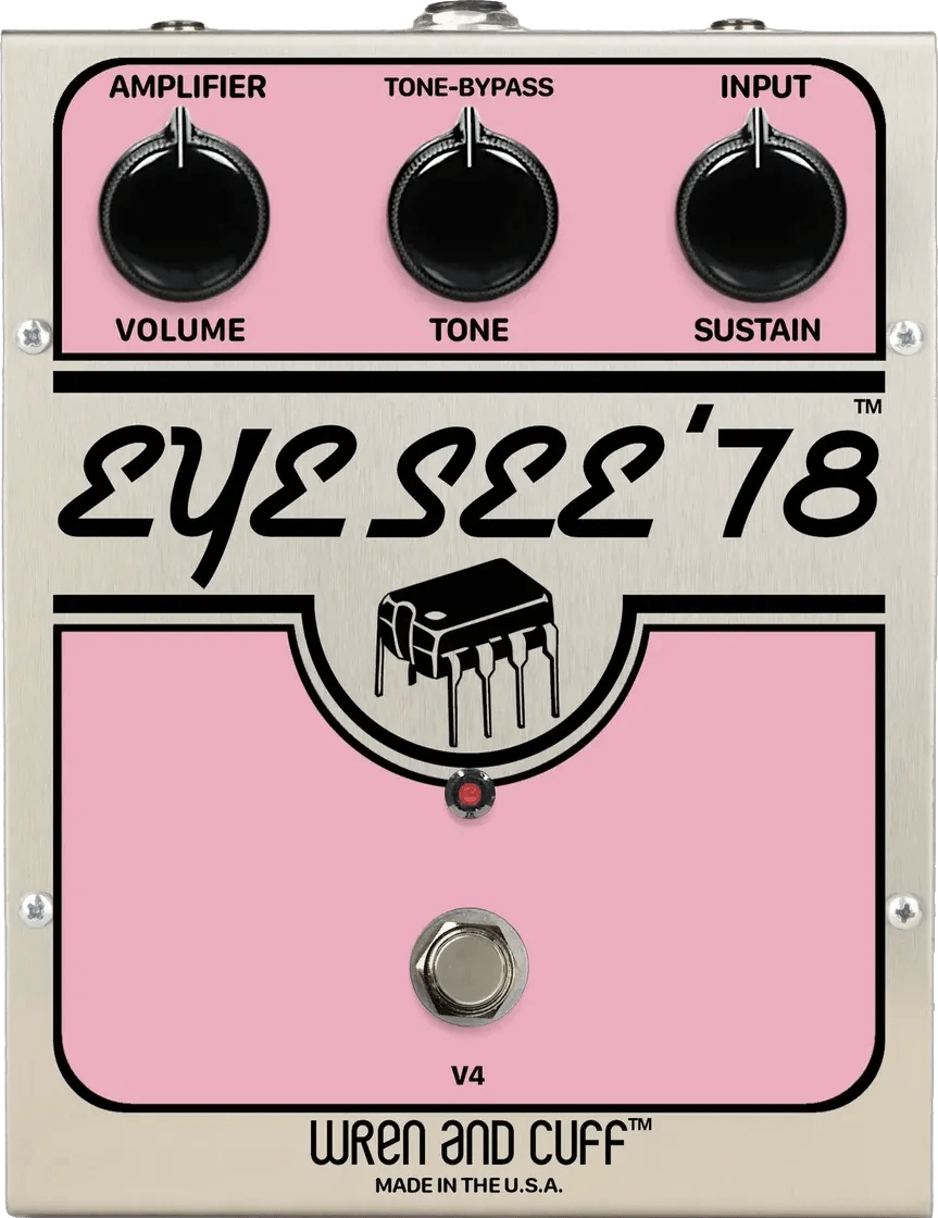 The Wren and Cuff Eye See '78 OG is an op-amp fuzz effects pedal designed as an accurate replication of the late-1970s V4 “IC” Muff circuit, including the V5 tone bypass switch. This fuzz stompbox uses operational amplifiers (integrated circuits) rather than transistors, reflecting the rare circuit variant produced for a brief period from 1978. The pedal’s tone bypass switch removes the passive tone stack, yielding a notable mid-frequency boost, increased output, and a more raw, open fuzz sound. Additional internal trim offers users further tonal adjustment. Built with through-hole components and a vintage-style circuit board, the Eye See '78 OG features a robust steel chassis, hand-silkscreened artwork, and distinctive bakelite-style knobs.