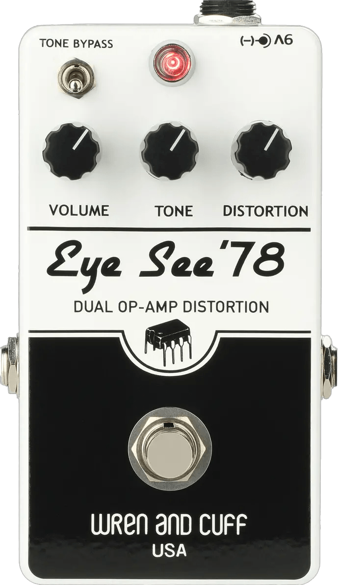 The Wren and Cuff Eye See Pi is an IC-based fuzz effects pedal inspired by late-1970s op-amp-driven circuit designs. Unlike transistor-based fuzz pedals, this fuzz stompbox uses operational amplifiers (op-amps) to deliver a distinctive, high-gain sound with aggressive character and pronounced sustain. The Eye See Pi includes a Tone Bypass switch, which removes the passive tone stack for increased volume and a raw, open sonic profile. Standard controls allow users to shape fuzz, tone, and output levels, while the pedal’s true bypass switching ensures your signal remains unaffected when the effect is disengaged. Compatible with standard 9V power supplies.