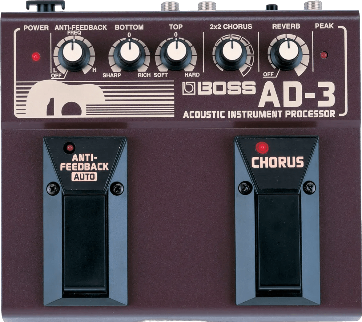 The BOSS AD-3 Acoustic Instrument Processor is an acoustic effects pedal designed to enhance and process electric-acoustic instrument signals. It features dedicated tone shaping controls for adjusting and refining your sound, along with built-in feedback suppression to minimize unwanted noise during live use. The AD-3 includes integrated reverb and chorus effects for adding depth and dimension to your acoustic tone.