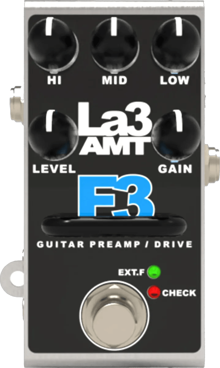 The AMT F3 Light is a single-channel analog preamp pedal designed to emulate tube amplifier tones. This preamp pedal provides clean, low-gain, and high-gain modes, allowing users to shape their sound across a wide tonal range. It incorporates an IR cabinet simulator for versatile direct output and precise cabinet emulation. Housed in a stainless steel enclosure with durable, modern labeling, the AMT F3 Light effects pedal is built for lasting use. Onboard controls allow for flexible tone adjustment, enabling guitarists or bassists to dial in their preferred settings.