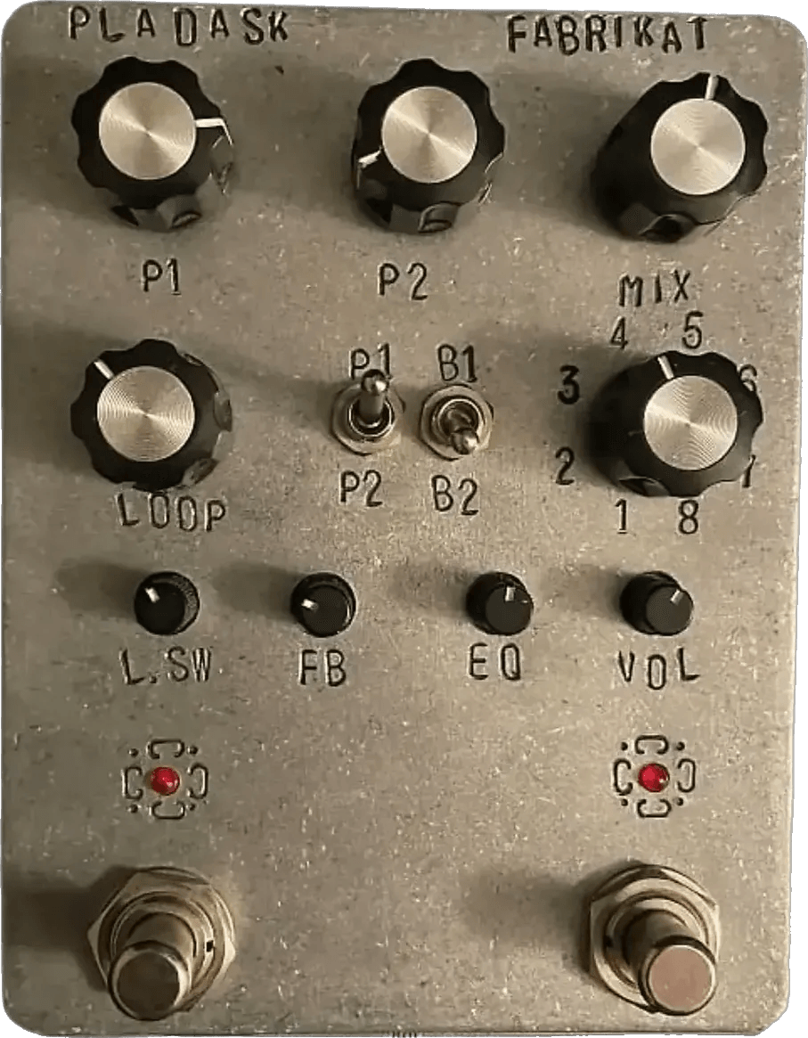 The Pladask Elektrisk Fabrikat is a multi-effects pedal and tabletop processor designed for experimental sound processing and manipulation. This device features 16 digital algorithms specializing in granular synthesis and altered sample playback. Algorithms include granular time stretching, pitch shifting, freeze, shuffled playback, glitch sampling, and a beat repeater. The Fabrikat enables real-time control of parameters, supporting both conventional pedal usage and hands-on tabletop operation.