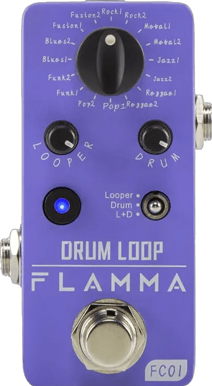 The Flamma FC01 Drum Loop is a compact drum machine and looper effects pedal designed for musicians seeking streamlined practice tools. This drum machine pedal provides 16 selectable drum patterns and includes a built-in looper with up to 20 minutes of recording time. Users can easily switch between drum rhythms with a dedicated single knob, and a three-way toggle offers quick access to drum machine mode, looper mode, or a combination of both.