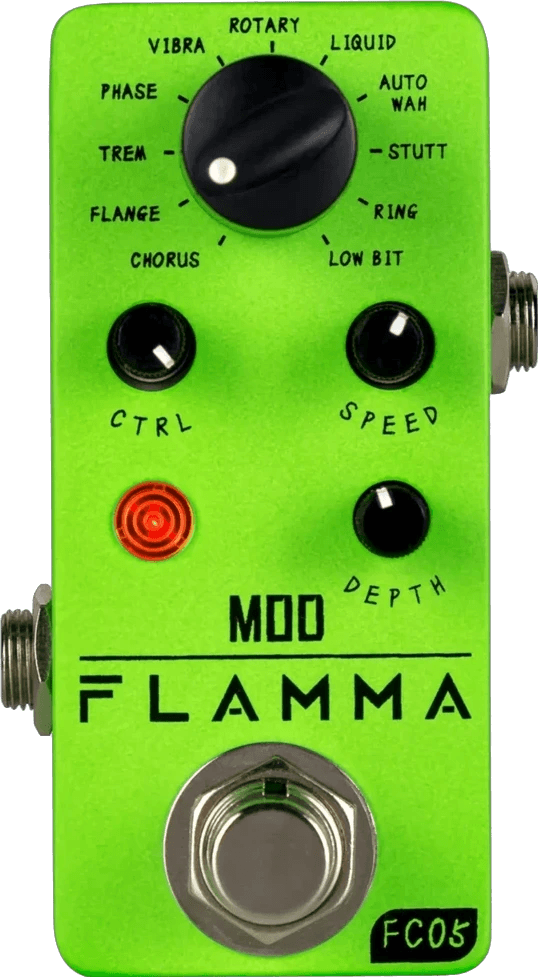The Flamma FC05 Mod is a compact modulation effects pedal offering 11 selectable modulation types in a micro enclosure. Effects include chorus, flanger, auto wah, stutter, ring modulator, and low bit among other classic and modern modulation options. Built inside a durable metal housing, the FC05 Mod fits easily on space-limited pedalboards and features straightforward control over all onboard effects. True bypass switching preserves signal integrity when the pedal is disengaged.