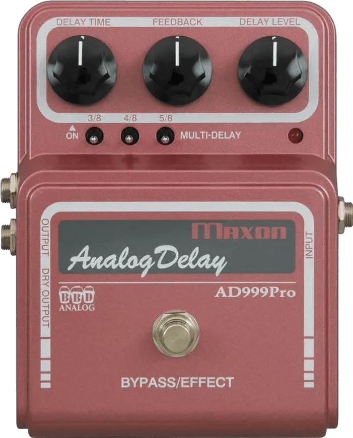 The Maxon AD-999 Pro is an analog delay pedal designed to deliver 900 milliseconds of delay using eight custom Maxon MC4107D Bucket Brigade ICs. This Maxon effects pedal integrates the circuitry of the AD999 and the noise reduction filtering from the AD-9 Pro to reduce aliasing, clock noise, and distortion. The result is smoother, more defined delay repeats while preserving the clarity of the original signal. Analog delay tone is maintained throughout, and all processing is true bypass for signal integrity when disengaged.