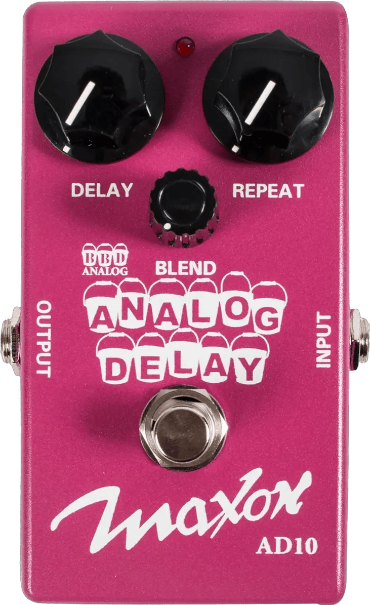 The Maxon AD10 is an analog delay pedal that provides up to 600 milliseconds of delay time, utilizing Maxon's decades of analog delay design expertise. This compact effects pedal delivers delay repeats with a natural-sounding, slightly saturated tone, maintaining clarity while avoiding excessive high-frequency artifacts. The straightforward control layout offers easy adjustment of delay time, repeat, and blend parameters for user-friendly operation. The AD10 features true bypass switching to preserve your instrument’s signal path when the effect is disengaged.