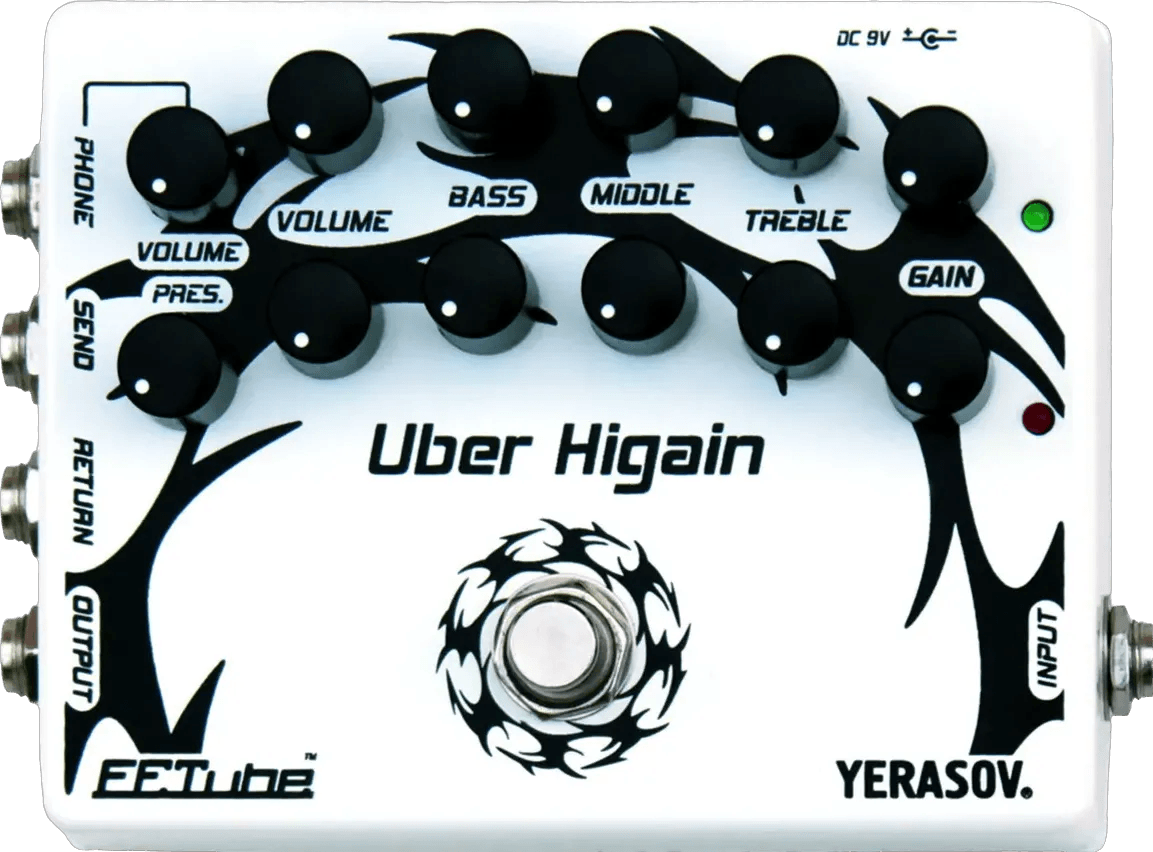 The Yerasov FETube Uber Higain UH-5 is a high-gain preamp effects pedal designed for detailed tube-style distortion using advanced JFET-based circuitry. This stompbox preamp delivers dynamic response similar to a tube amplifier, with two distinct channels influenced by iconic German-American amplifier designs. Each channel offers independent tone shaping. Connectivity options include an effects loop for signal chain integration and a headphone output equipped with cabinet simulation.