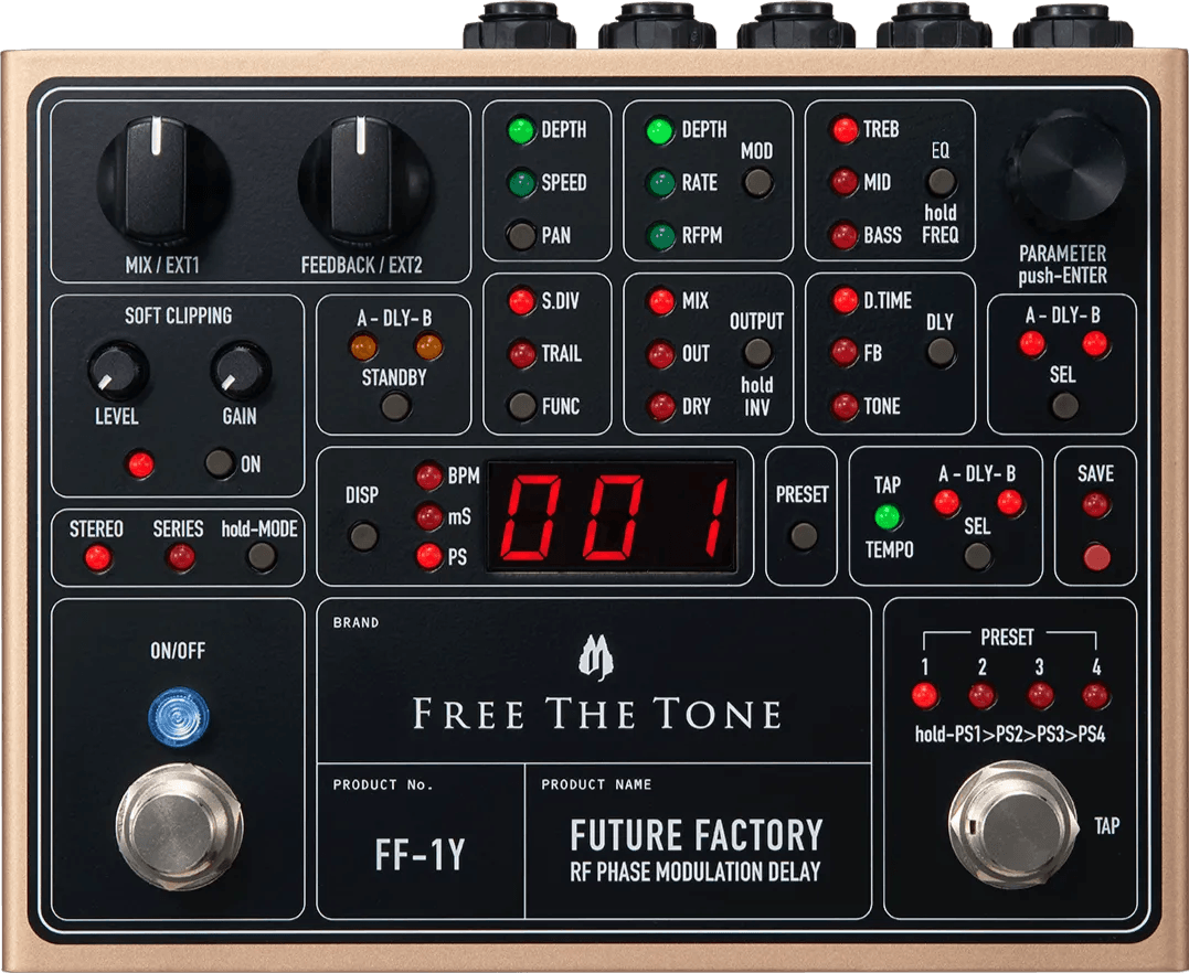 The Free The Tone FF-1Y Future Factory is a digital delay effects pedal designed to deliver advanced stereo delay and modulation options. It features a proprietary modulation system where the phase of the LFO modulates randomly based on signal attenuation, instead of following the typical fixed-cycle approach. This generates a dynamic and evolving modulation character, with pronounced spaciousness when used in stereo delay mode. The pedal provides comprehensive control over delay and modulation parameters, enabling a wide range of time-based effects for studio and live performance.