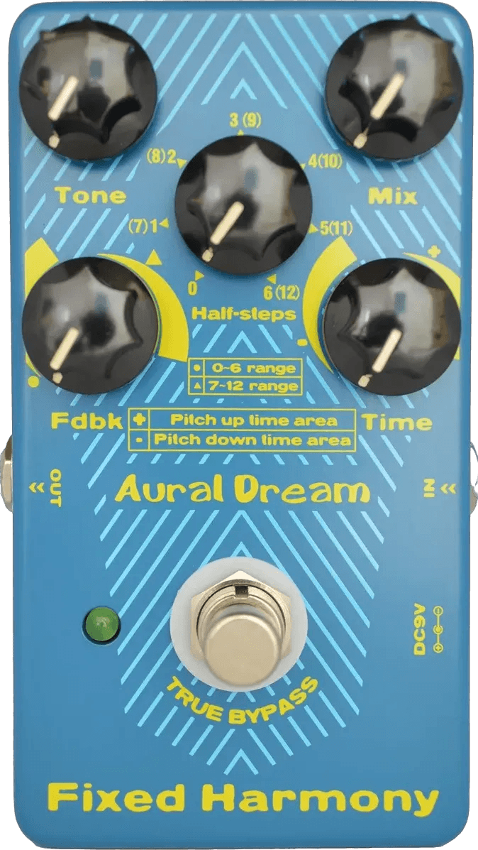 The Aural Dream Fixed Harmony is a harmony effects pedal designed for generating semitone shifts, octave effects, and harmonic layering. It offers adjustable delay time and feedback controls for creating custom harmonic sequences. This pedal features true bypass switching and incorporates a low-power circuit. It can be powered via standard adapter or an external battery connection using the included clip cable.