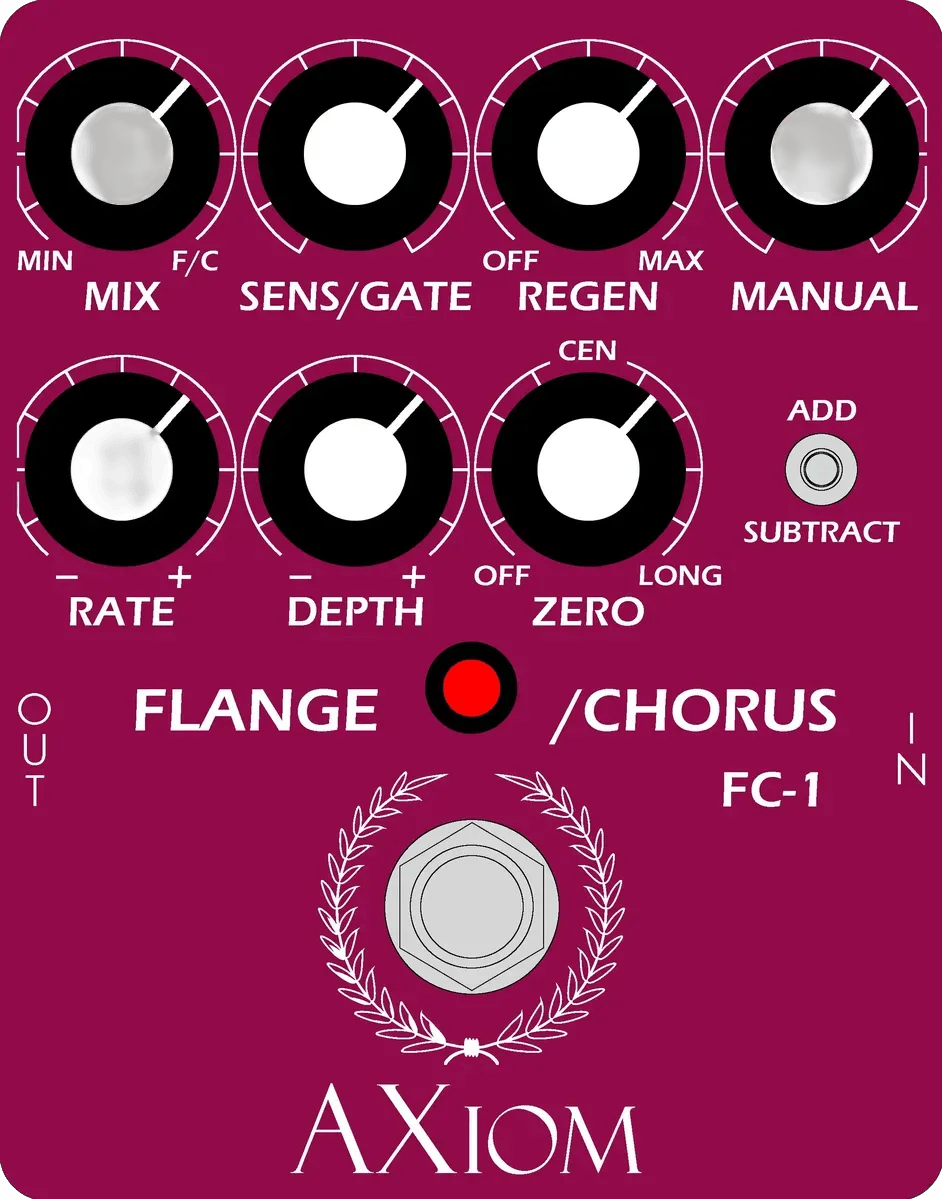 The Axiom Flange-Chorus FC-1 is an analog flange and chorus effects pedal featuring a wide-range bucket brigade device (BBD) circuit. This flanger pedal offers variable delay sweeps from 15ms down to 0.4ms, a range characteristic of late 1970s and early '80s analog flangers but rarely found in modern analog designs. In addition to its flanging capabilities, the FC-1 also includes a dedicated analog chorus effect, providing a versatile modulation tool in a single unit. The pedal is engineered for advanced control with all-analog signal processing.
