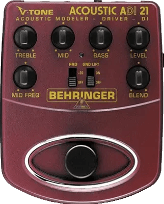 The Behringer ADI21 V-Tone Acoustic Driver DI is an acoustic preamp and direct box designed to enhance and shape the sound of piezo-equipped acoustic instruments. This acoustic DI box features active direct injection, built-in tube and microphone emulation circuitry, and a flexible 3-band EQ with adjustable mid frequencies. The Blend control allows precise mixing between the emulated and direct signals. The ADI21 is equipped with a footswitch for straightforward operation and can be used as a standard active DI box by bypassing the emulation.