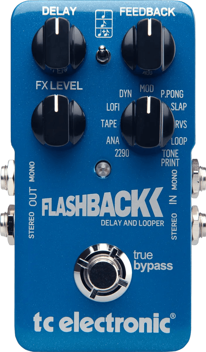 The TC Electronic Flashback Delay is a multi-mode digital delay effects pedal, designed to deliver a range of delay sounds with up to 7 seconds of delay time. Featuring algorithms inspired by the classic 2290 delay, this stompbox includes multiple selectable delay types that cover digital, analog, and tape-style repeats. Core controls include Delay Time, Feedback, and Level, plus a Mode selector for instant access to different delay effects. True bypass switching preserves your signal clarity when the pedal is disengaged. The pedal also supports stereo input and output for wide imaging and compatibility with various setups.