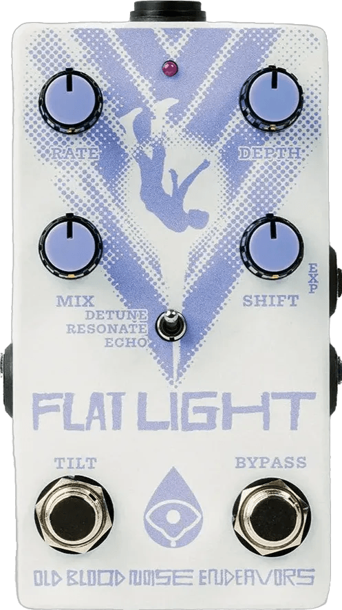 The Old Blood Noise Endeavors Flat Light is a flanger effects pedal that expands on traditional flanger sounds by offering three selectable modes: pitch shifting, additional flanger lines, and echo, layered over the core flanging effect. Each mode is accessible via a toggle switch, allowing users to manipulate the modulation character and depth. The pedal features controls for Manual, Rate, and Depth, as well as a Shift knob to adjust pitch or delay time, depending on the selected mode. The Flat Light uses true bypass switching for uncolored signal pass-through when bypassed.