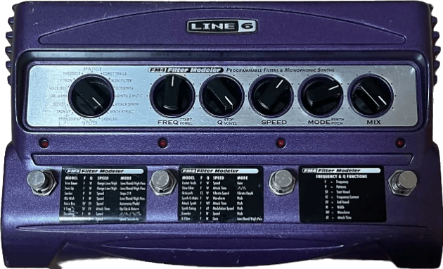The Line 6 FM4 is a filter modeling effects pedal that provides a range of classic and modern filter sounds for music equipment setups. This stompbox offers 16 modeled filter, synth, and vocoder effects, featuring controls for Frequency, Q, Speed, and Mix to shape filter response and modulation. The four footswitches enable instant access to user presets, while the expression pedal input allows real-time control of parameters such as filter sweeps or mix balance. The FM4 features mono input and output for streamlined connection with pedalboards and rack systems. This unit operates with true bypass circuitry to preserve signal integrity when disengaged and is compatible with bass instruments.