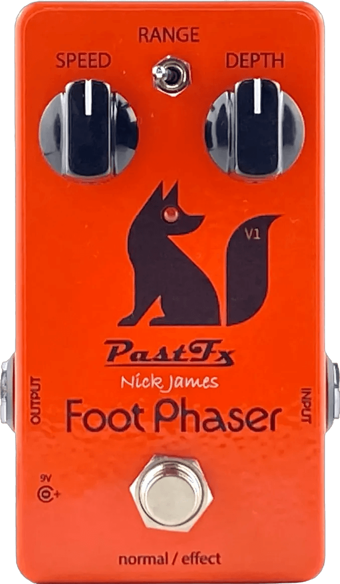 The PastFx Nick James Foot Phaser is a phaser effects pedal developed in collaboration with Nick James of Peril Pedals, designed as a recreation of the original foxx Foot Phaser V1. This analog phaser pedal uses a 10-stage transistor-based circuit, replicating the sonic characteristics of the classic 1970s phase shifter. The pedal provides control over phasing speed via both a rotary knob and treadle mechanism, mirroring the unique interface of the vintage model. Precise hand-matching of the transistors ensures consistent phase response across all stages.
