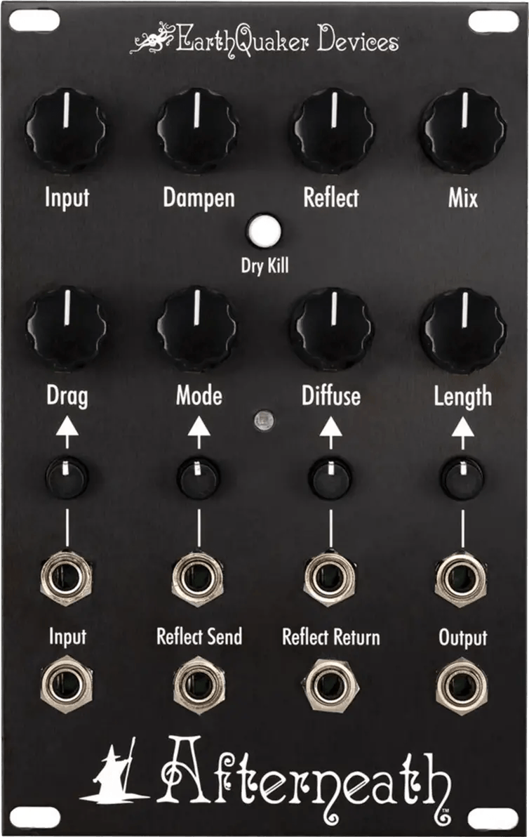 The EarthQuaker Devices Afterneath Eurorack Module is an effects module designed to deliver ambient reverberation and delay textures within a modular synth setup. This reverb eurorack module offers stereo-like, multi-layered atmospheric effects, utilizing an analog dry path alongside a digital wet path. The module provides CV control over four parameters—Length, Dampen, Reflect, and Drag—each with a dedicated attenuverter for shaping modulation. An audio send and return enables external processing of the feedback path. Key sound-shaping controls include Length (decay time), Dampen (treble response), Reflect (regeneration), Mix (wet/dry blend), Diffuse (smearing of repeats), and Drag, which separates or clusters the internal delay lines for distinct echo patterns or dense reverb.