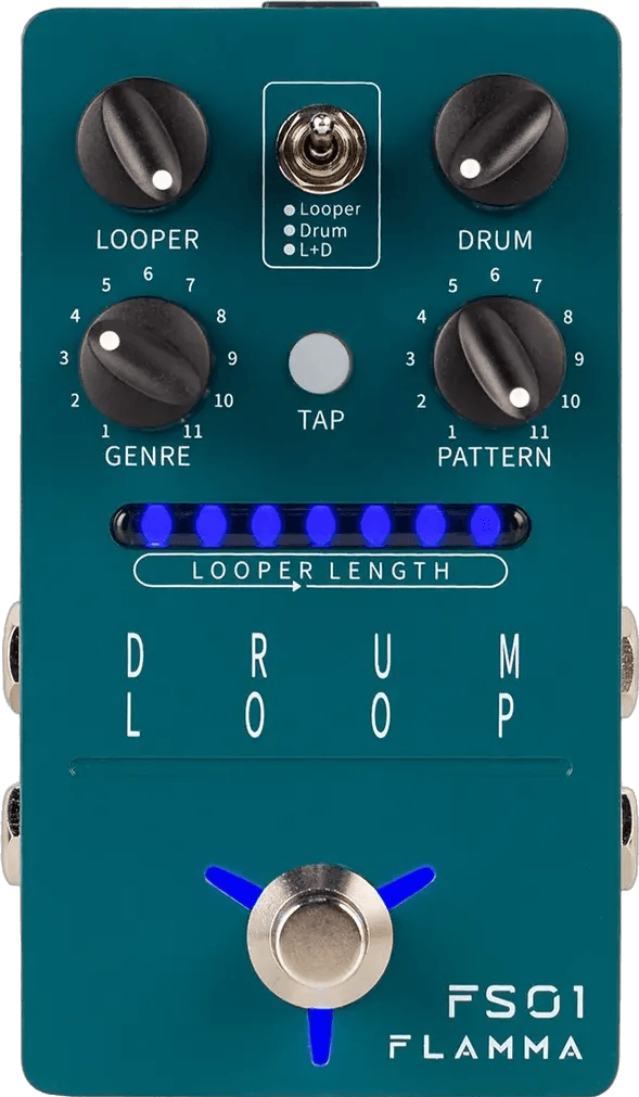 The Flamma FS01 Drum Machine & Phrase Loop is a drum machine pedal and looper designed for creating and managing loops with integrated rhythmic patterns. This pedal offers a drum machine with 11 selectable groove styles, each providing various time signatures and tempo variations for a total of 121 beat patterns. The phrase looper delivers up to 20 minutes of recording time, functioning either independently or simultaneously with drum playback. Visual bar indicators support precise timing when layering and dubbing loops. The FS01 features independent volume controls for both the looper and drum machine, as well as stereo output connectivity.
