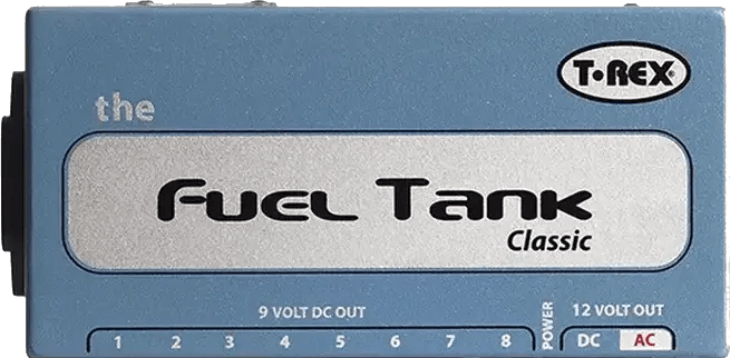 The T-Rex Fuel Tank Classic is a multi-output pedalboard power supply designed for effects pedals and music gear. It features three isolated output sections: 9V DC, 12V DC, and 12V AC, supporting a range of pedal requirements. The unit delivers up to 1500mA total current via ten DC output plugs, minimizing noise by providing isolated power to connected devices. The compact enclosure fits most pedalboard setups. All necessary power cables are included for easy integration.