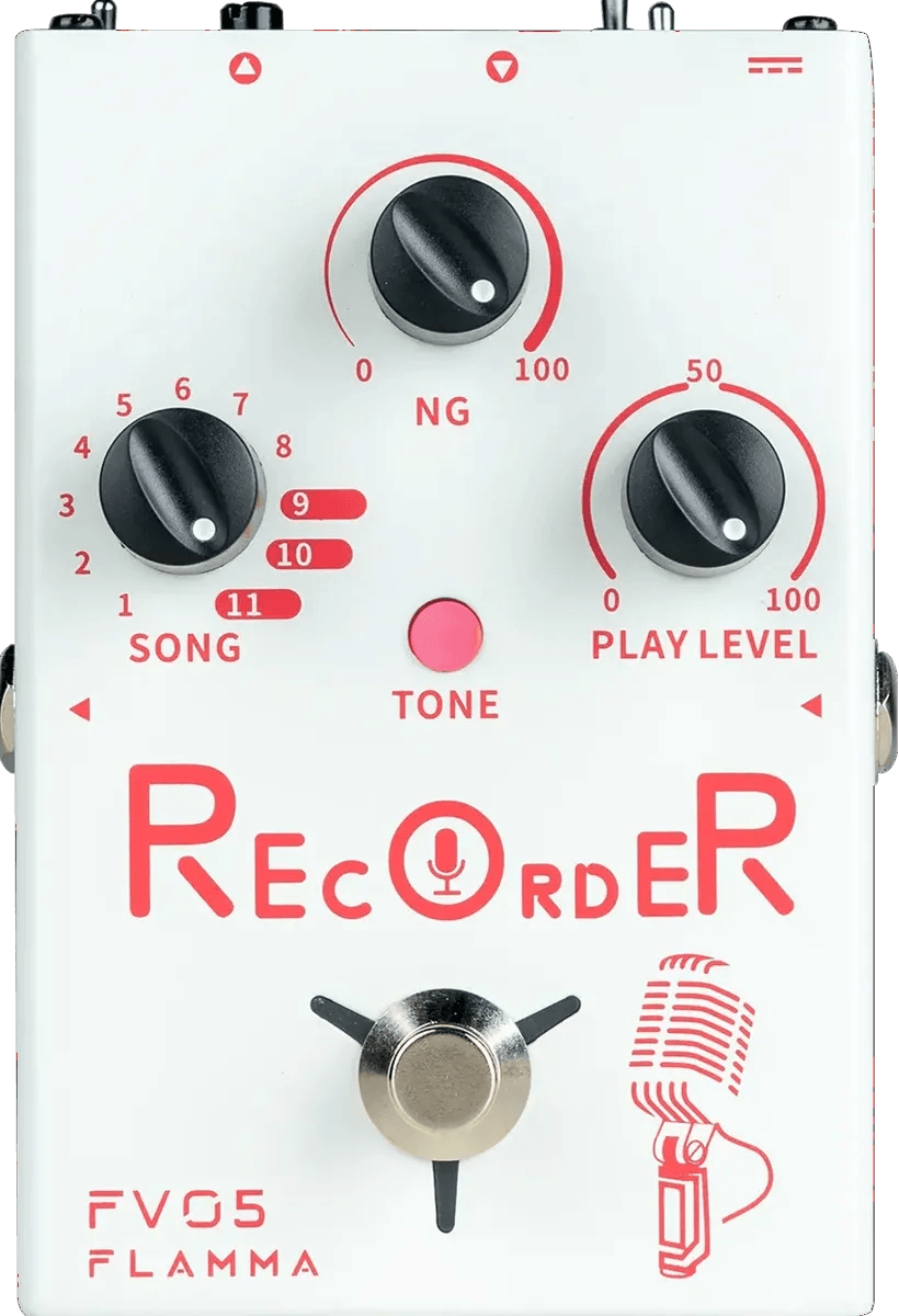 The Flamma FV05 Recorder pedal is a vocal effects pedal designed for recording, processing, and enhancing vocal signals. This multifunction vocal processor offers recording functionality with a range of sound-shaping effects and flexible connectivity. The FV05 Recorder includes onboard reverb, selectable EQ modes (FLAT, WARM, BRIGHT) with a built-in compressor function, and a noise gate for controlling unwanted noise. Essential gain control is provided, allowing dynamic adjustment of input levels. Multiple input and output options support versatile routing to accommodate different setups and recording workflows.
