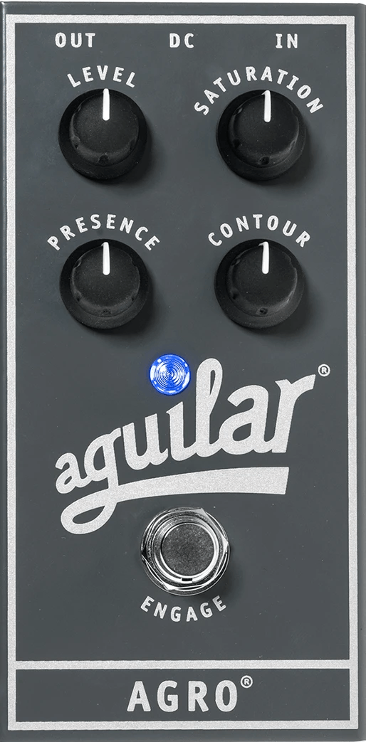 The Aguilar Agro bass overdrive pedal is designed to deliver saturated overdrive and distortion, utilizing the AG500 saturation channel. This analog effects pedal offers a range of tube-like grit and warmth, with controls tailored for detailed bass response. The unit features four rotary knobs for Level, Saturation, Contour, and Presence, allowing for precision adjustment of gain structure and tonal shape. True bypass switching maintains clean signal integrity when the pedal is disengaged. The Aguilar Agro is designed specifically for bass instruments.