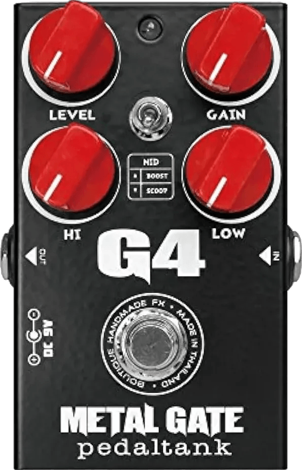 The Pedaltank G-4 Metal Gate is a high-gain metal distortion pedal designed to deliver heavy, gated distortion effects suitable for drop tuning and aggressive genres. Four control knobs allow users to shape the gain, tone, level, and gate threshold, while a toggle switch provides additional options to either boost or scoop the mid frequencies. The circuit incorporates a MOSFET transistor for compressed gain and output, and true bypass switching ensures your bypassed signal remains unaffected with no crosstalk noise.