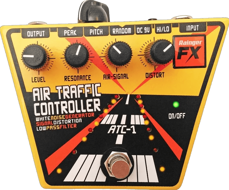 The Rainger FX Air Traffic Controller is a distortion effects pedal that combines a custom Rainger FX distortion circuit with a white noise generator, routed through a low pass filter. The filter’s cut-off frequency can be set to respond to the input signal’s envelope, pitch, or via a random modulator.