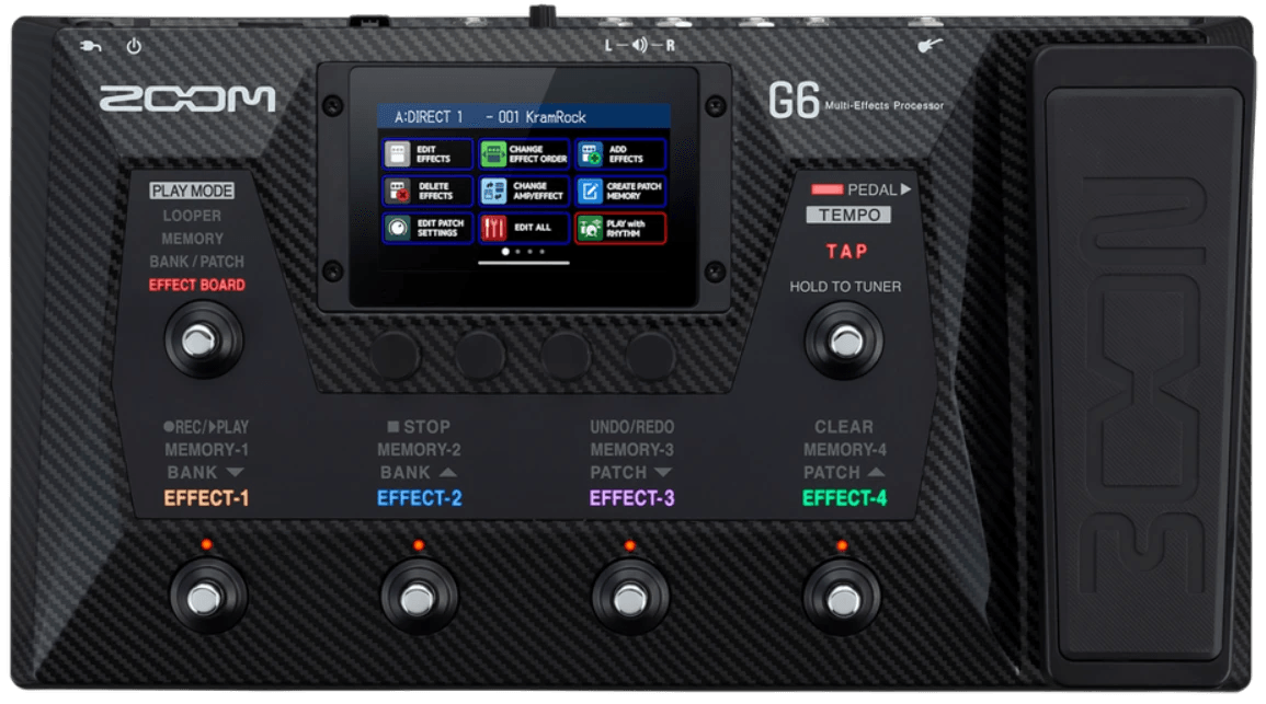 The Zoom G6 is a multi-effects pedal designed for guitar that offers a range of amp modeling, effects, and impulse response (IR) options. It features classic and modern amp models, custom Zoom amplifier sounds, and newly developed distortion and modulation effects. The unit provides cabinet emulation for modeled amps and includes 70 pre-loaded impulse responses, each captured with various microphone types and placements. Users can also import and manage over 100 custom impulse responses for additional tone shaping. The G6 uses a 4.3-inch color touchscreen interface for intuitive sound editing, allowing users to drag and drop effect modules in a user-friendly manner.