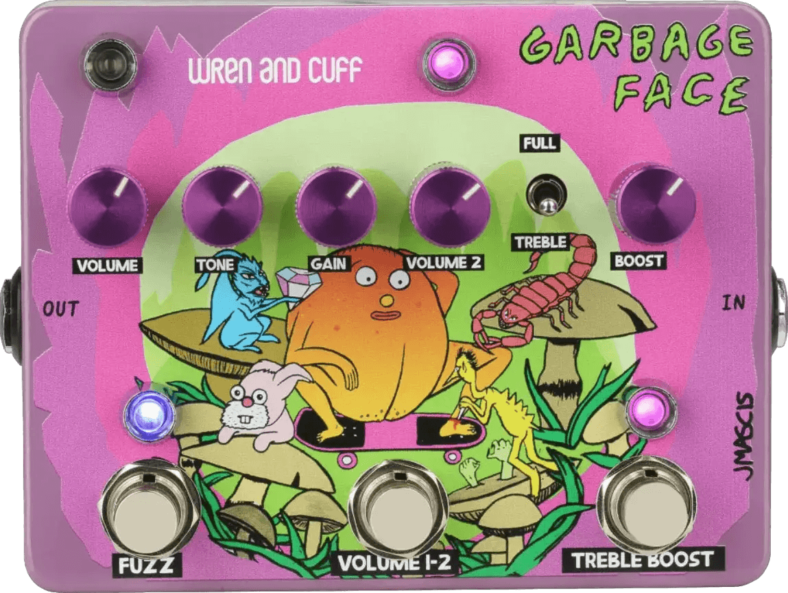 The Wren and Cuff Garbage Face is a signature fuzz effects pedal designed to recreate the specific tones found in J Mascis’s longtime analog setup. This pedal features a meticulous, component-accurate recreation of a late-70s Ram’s Head fuzz circuit, based on Mascis’s original unit. It includes a germanium treble booster circuit, accessible via a dedicated footswitch, allowing further tonal shaping. A dual-volume control system enables seamless switching between two preset output levels for dynamic live performance. The pedal operates in mono format with standard instrument input and output, and utilizes true bypass switching for signal clarity when disengaged.